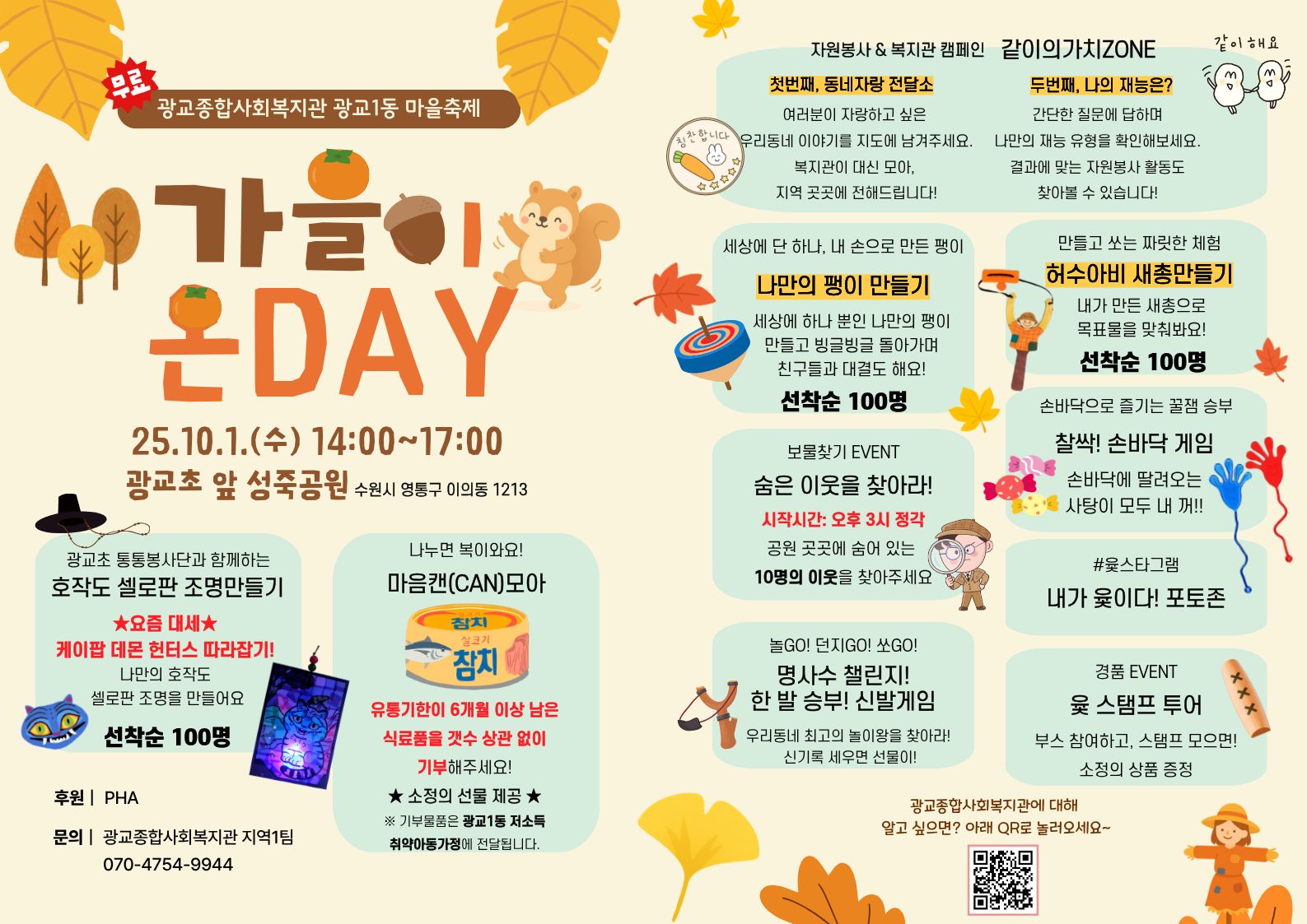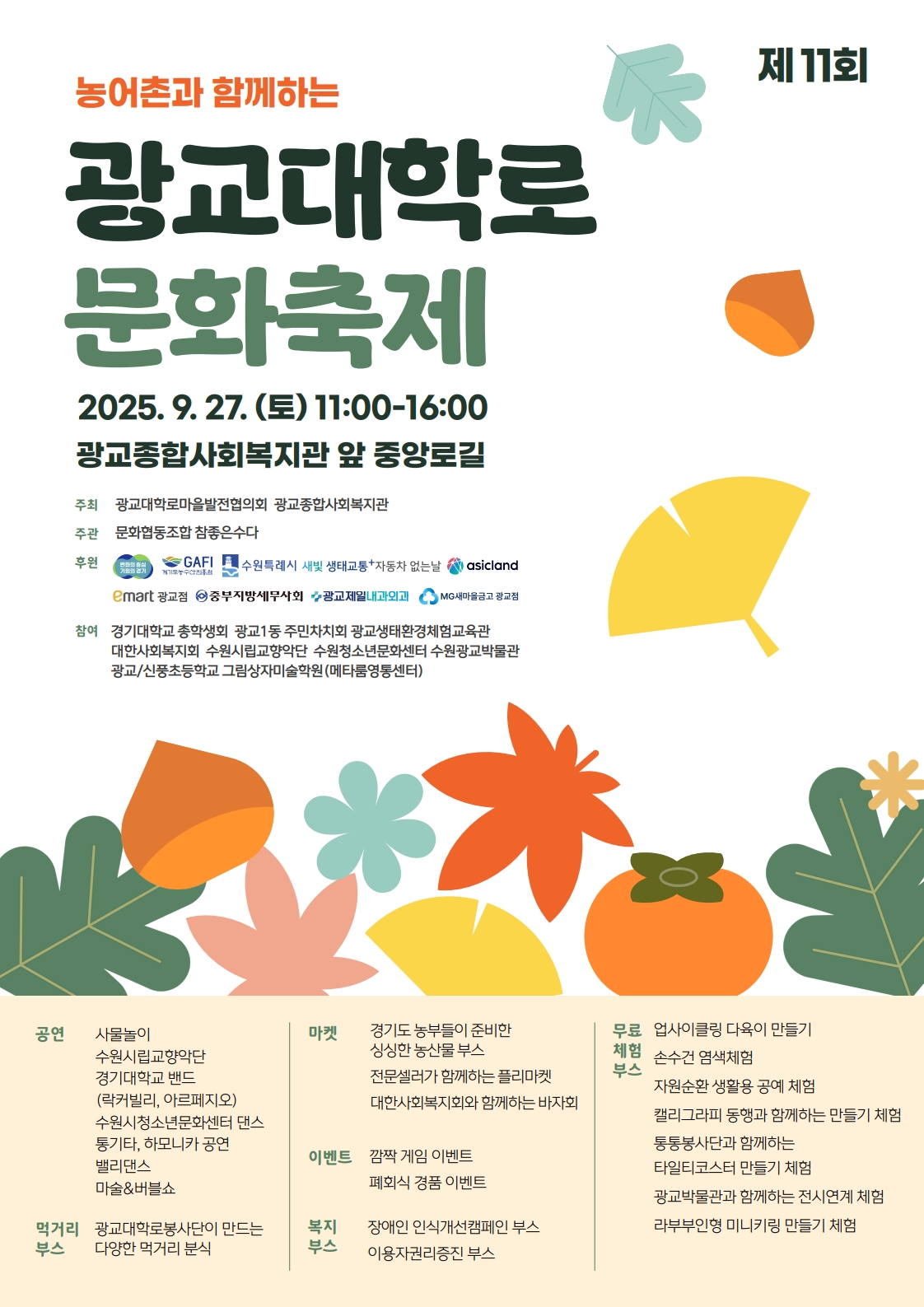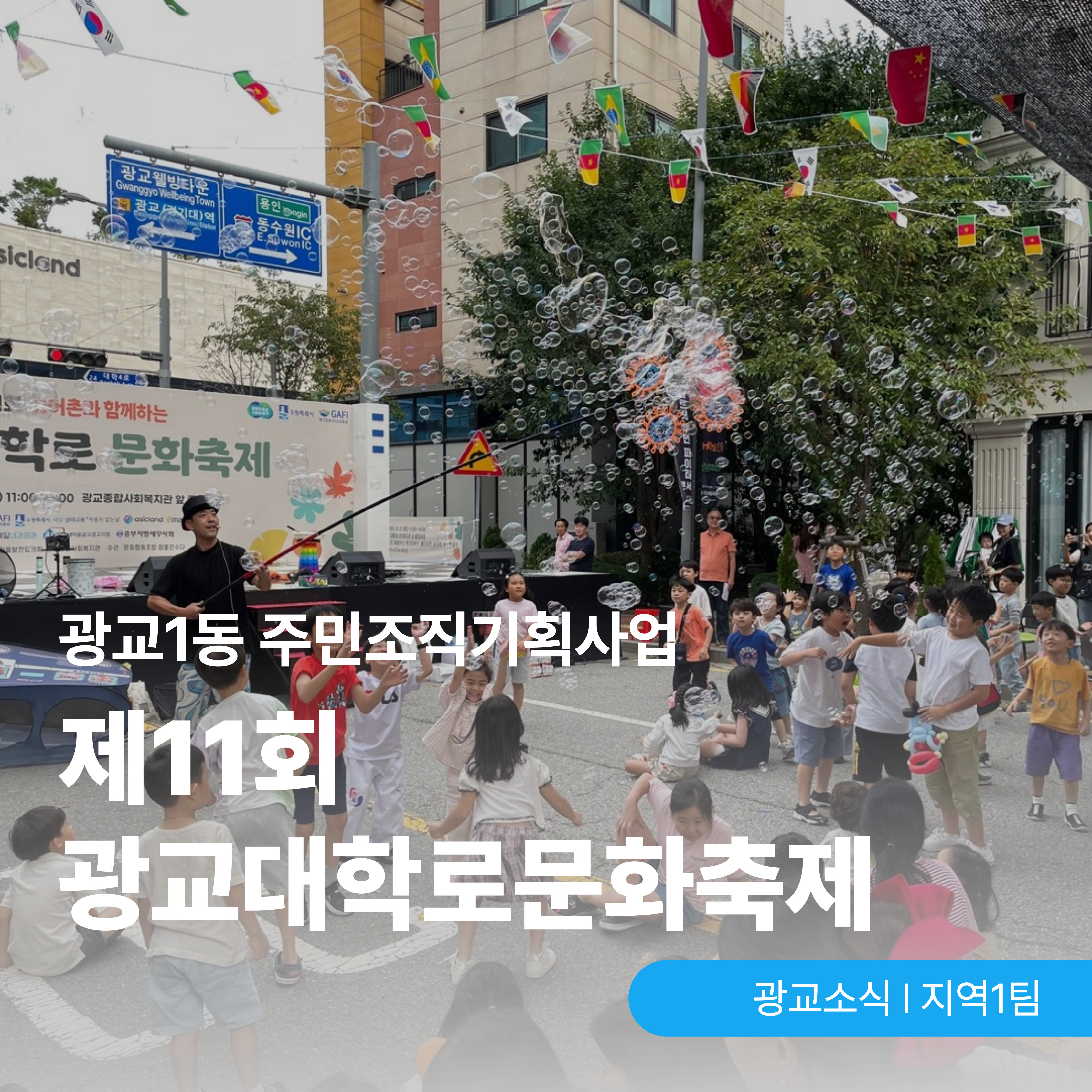 지난 9/27 토요일, 제11회 광교대학로문화축제가 많은 주민들의 참여 속에 즐겁게 마무리되었습니다!광교대학로마을발전협의회와 광교종합사회복지관이 11번째 함께 준비한 이번 축제는, 주민들이 기획하고 만들어가는 ‘우리 마을 축제’라서 더욱 뜻 깊었는데요.지역의 여러 기관과 함께 협력하여 마을 공동체 문화를 나누고 주민 간 소통의 기회로 삼는 놀이 문화의 장으로서 마련되었습니다.행사 당일에는 다채로운 프로그램이 진행되었습니다.무대 공연으로는 수원시립교향악단의 아름다운 선율이 울려 퍼졌으며, 경기대학교 밴드와 청소년문화센터 친구들의 공연도 이어져 활기찬 분위기를 더했습니다.체험 부스에서는 타일 티코스터 만들기, 팽이 만들기, 리유저블백 만들기 등 온 가족이 함께 참여할 수 있는 프로그램이 마련되어 많은 호응을 얻었습니다.또한 농산물 직거래 장터와 바자회, 다양한 먹거리 부스가 운영되어 축제의 맛을 더했습니다.올해 축제에도 함께해주신 감사한 분들이 있습니다.광교생태체험학습관, 광교박물관, 광교/신풍초등학교를 비롯한 지역의 다양한 기관들이 참여하여 프로그램을 풍성하게 꾸며주셨는데요!그 외에도 지역 상가와 기업이 후원과 참여로 함께하여 축제가 더욱 의미 있게 진행될 수 있었습니다.특히, 올해 제11회 광교대학로문화축제에는 더 많은 주민과 가족들이 참여하여 거리가 가득 메워졌습니다.주민들은 "직접 기획해서 더욱 보람찼다.", "아이들과 함께 즐길 수 있어 좋았다."는 소감을 전했습니다.이번 축제를 통해 주민 주체 축제의 의미와 지역 공동체의 가치를 다시금 확인할 수 있었습니다.끝으로 함께해주신 주민, 자원봉사자, 유관기관, 후원자 여러분께 진심으로 감사드립니다.광교대학로문화축제는 앞으로도 주민이 중심이 되는 마을 축제로서 지역 기관과의 협력을 확대하고,더욱 다양한 콘텐츠를 개발하여 성장해 나갈 예정입니다.내년 9월에 다가올 제12회 광교대학로문화축제에도 많은 관심과 참여를 부탁 드립니다♥[광교대학로문화축제는 경기도농어업농어촌사업, 수원특례시 자동차없는날 사업에 지원을 받았으며,에이직랜드, 이마트광교점, 광교제일내과외과, 새마을금고 광교점, 중부세무사회, 광교대학로마을상가 32곳의 후원으로 진행되었습니다.]