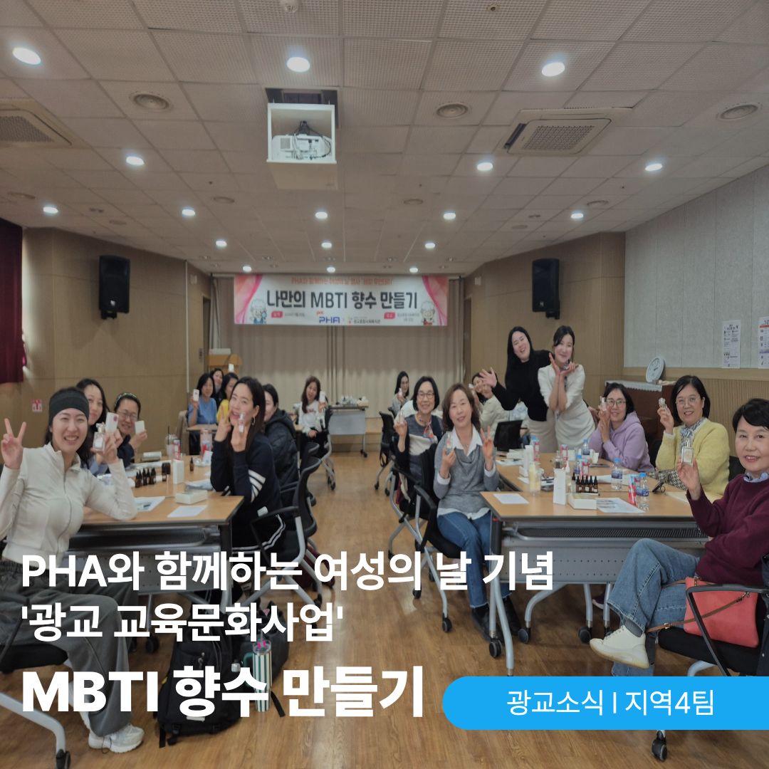 지난 3월 18일, 광교종합사회복지관에 지역사회를 향한 따뜻한 나눔을 실천하기 위해 PHA 임직원분들께서 발걸음해주셨습니다.이번 만남은 '여성의 날'을 기념하여 우리 지역의 여성분들을 응원하기 위해 마련되었습니다. PHA에서 전해주신 후원금 500만 원의 일부는 지역 내 여성 사회적 배려계층을 위한 생필품 꾸러미 ‘응원파(PHA)우치’ 지원으로 사용되었습니다. 특히 이번 나눔은 단순히 후원금을 전달하는 것에 그치지 않고, 임직원분들께서 파우치 제작 과정에도 동참해 주셔서 그 의미가 더욱 깊었습니다. 그 첫 행보로, PHA 임직원분들과 우리 복지관 식구들이 머리를 맞대고 ‘응원 파(PHA)우치’ 제작에 나섰습니다.생리대부터 휴족패치, 수분크림, 마스크팩, 철분제, 핸드크림, 온열팩까지. 여성의 건강하고 편안한 하루를 위해 꼭 필요한 물품들을 골라 담았습니다. 꼼꼼하게 포장하고, 파우치 하나하나에 정성 어린 응원 메시지를 작성하는 임직원분들의 손길에서진심 어린 온기를 느낄 수 있었습니다.기업과 지역사회가 함께 우리 이웃의 하루를 응원하는 뜻깊은 시간이 되었습니다.바쁜 일정 중에도 직접 방문하여 구슬땀을 흘려주신 PHA 임직원분들께 다시 한번 깊은 감사를 드립니다. 이날 정성껏 준비한 55개의 응원 파우치는 장애인/느린 학습자를 양육하는 보호자분들과지역 내 여성 사회적 배려계층 당사자 총 55명에게 소중히 전달될 예정입니다. 남은 후원금은 지역 여성 주민분들을 위한 ‘원데이 클래스’ 운영에 소중히 사용할 계획입니다.다가오는 3월 25일, 나만의 향기로 힐링하는 원데이 클래스가 진행될 예정이니 기대해주세요! “PHA와 광교종합사회복지관은 지역의 모든 여성을 응원합니다.” ■ 지역1팀 070-4754-9932