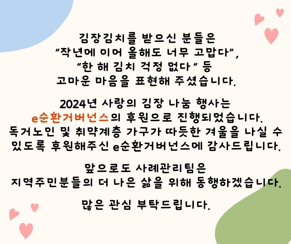 제목 2024. 11. 6.(수) [사례관리팀] '자원연계기반 경제지원사업_김장행사'